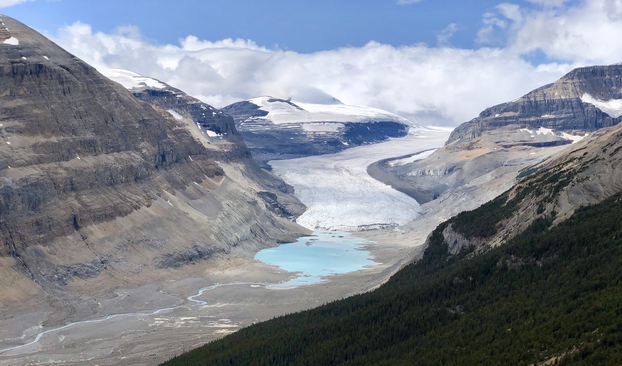 What you have is the Columbia Ice Field, which, as the name suggests, is a huge (125 sq. miles!) field of pure white snow and ice at a very high altitude. It stretches out into 6 different glaciers. The Saskatchewan glacier is one of them. The entire glacier is visible from the ridge. At the bottom of the glacier is a sky blue lake which then feeds a small winding river. On the other side of the glacier valley is another ridge. There’s a thin but extremely tall waterfall that cascades down this ridge. The sound of this waterfall echoing through the valley, on top of the background of near silence with occasional wind gusts, is just so peaceful, so serene, so calming, it’s mystical.